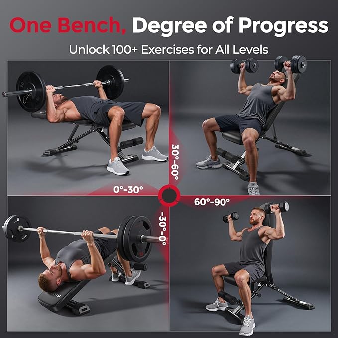 144 Adjustable Positions for Full-Body Training: With a range from -30° to 90° (flat/incline/decline/upright), this workout bench enables effective exercise for every major muscle group from chest and shoulders to core; The -10° decline offers a gentle intro to decline bench press lifting; Perfect 90° upright lock for shoulder & arm isolation